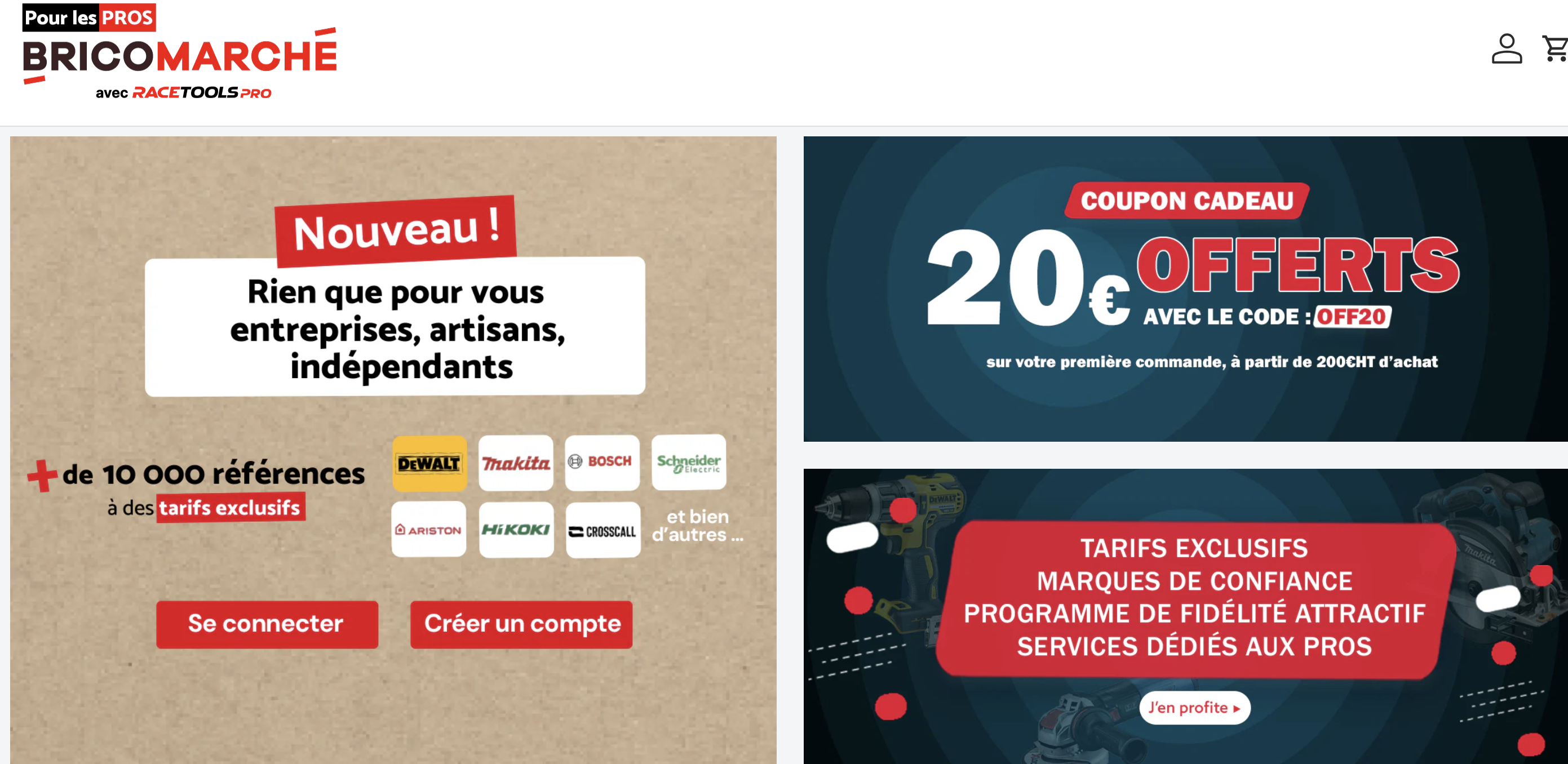 La mode est aux pros chez les GSB mais là Bricomarché concocte dans son coin un site pro et c'est sur les platebandes de Manomano pro que le champion de la famille ITM Equipement de la maison compte bien se promener. Pour l'instant l'offre de services n'est pas comparable mais la bataille est lancée. On se souvient que le groupe avait acheté Brico Privé et Racetools avant d'abandonner le premier. Racetools en revanche , déjà pro dans l'âme a continué à se développer avec une connexion et désormais des services « adaptés à tous les Pros, à tous les travaux » comme un service client dédié basé en France. "Nos agents sont disponibles par mail et par téléphone du lundi au vendredi de 8h à 16h. Que ce soit pour un souci technique, de livraison ou une demande d'information sur notre offre, nous répondrons à vos demandes dans les meilleurs délais." explique le site. Mais tout ce travail Racetools. pro l'a développé aussi pour ... Bricomarché En effet le site de la GSB propose un popup aux artisans intéressés par une offre pro, une inscription et si le header (le bandeau de tête du site) est différent entre les 2 sites cousins, l'environnement est le même. Il y a tout de même une différence majeure : une fois identifié sur le site bricomarché pro by Racetools, vous pouvez acheter une baignoire et tout le catalogue Bricomarché tandis que le client pro de racetools ne pourra acheter que des outils